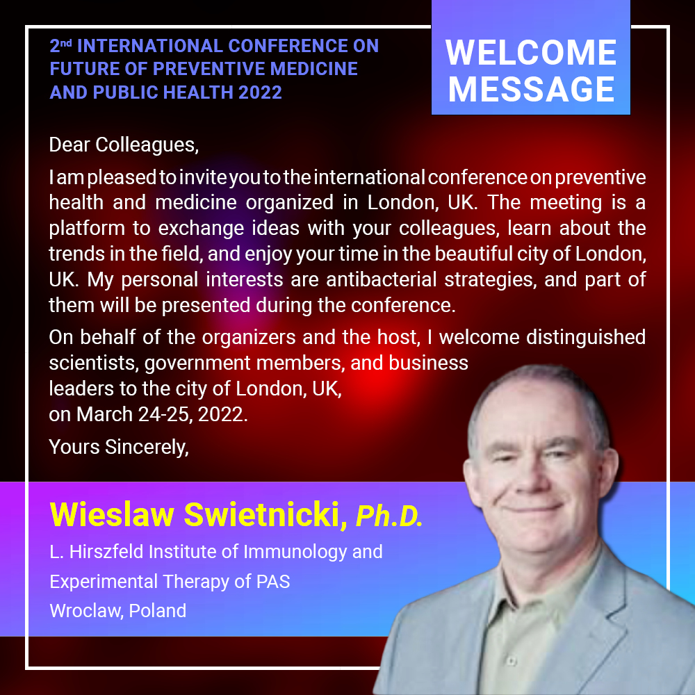 Peers Alley Scientific Committee takes colossal delight to invite all the participants around the globe to join us at The International Conference on Future of Preventive Medicine and Public Health which will be held on March 24-25, 2022 in London, UK.